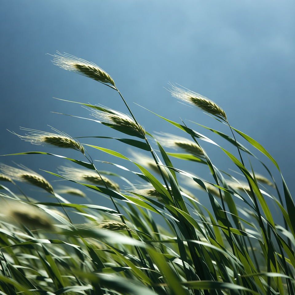 Tall wheat stalks with golden heads sway gently in the wind. They stand against a bright blue sky with soft clouds. The image captures the detailed textures of the green leaves and fluffy seed heads.