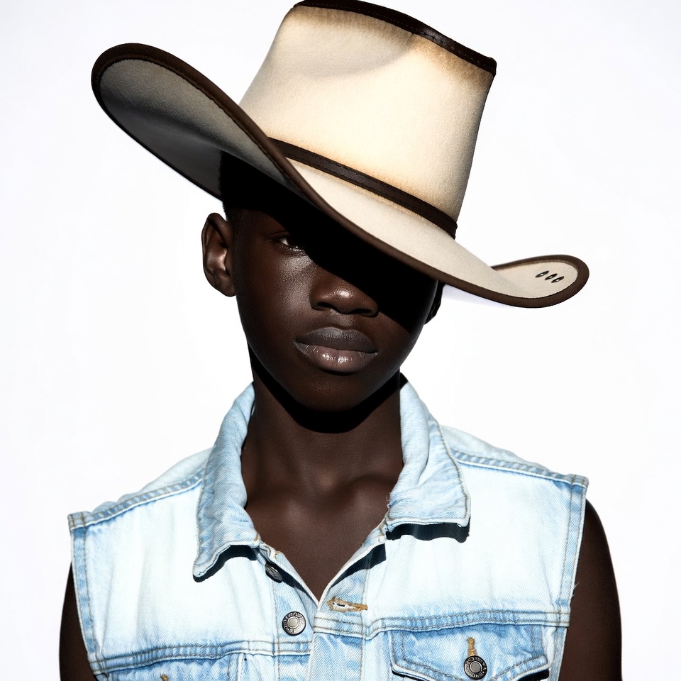 A young African man with dark skin poses confidently against a white background. He wears a large cream-colored cowboy hat with brown brim and a sleeveless light blue denim vest. His face is partially shadowed by the hat's brim.