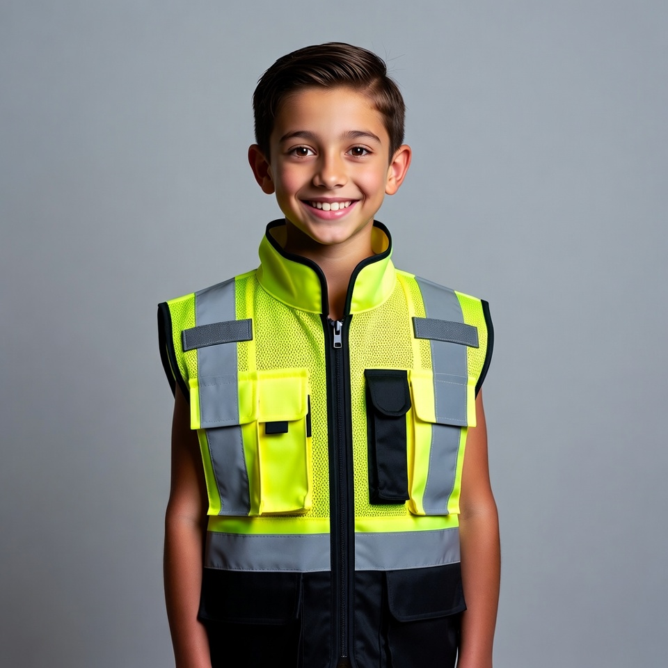 A young boy with short dark hair and a big smile stands frontally against a plain gray background. He wears a bright yellow high-visibility safety vest with reflective silver strips, black accents, and multiple pockets. The vest features a zipper and mesh panels for breathability.