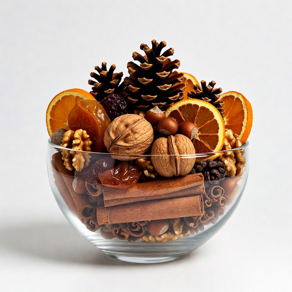 Glass bowl of nuts oranges pinecones cinnamon