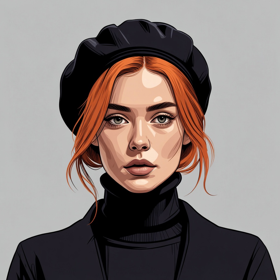 White, beret hat, black beret, black sweater, closeup, digital illustration, fashion, female, ginger hair, green eyes, high collar, illustration, portrait, red hair, redhead, stylish, turtleneck, vector art, wavy hair, woman