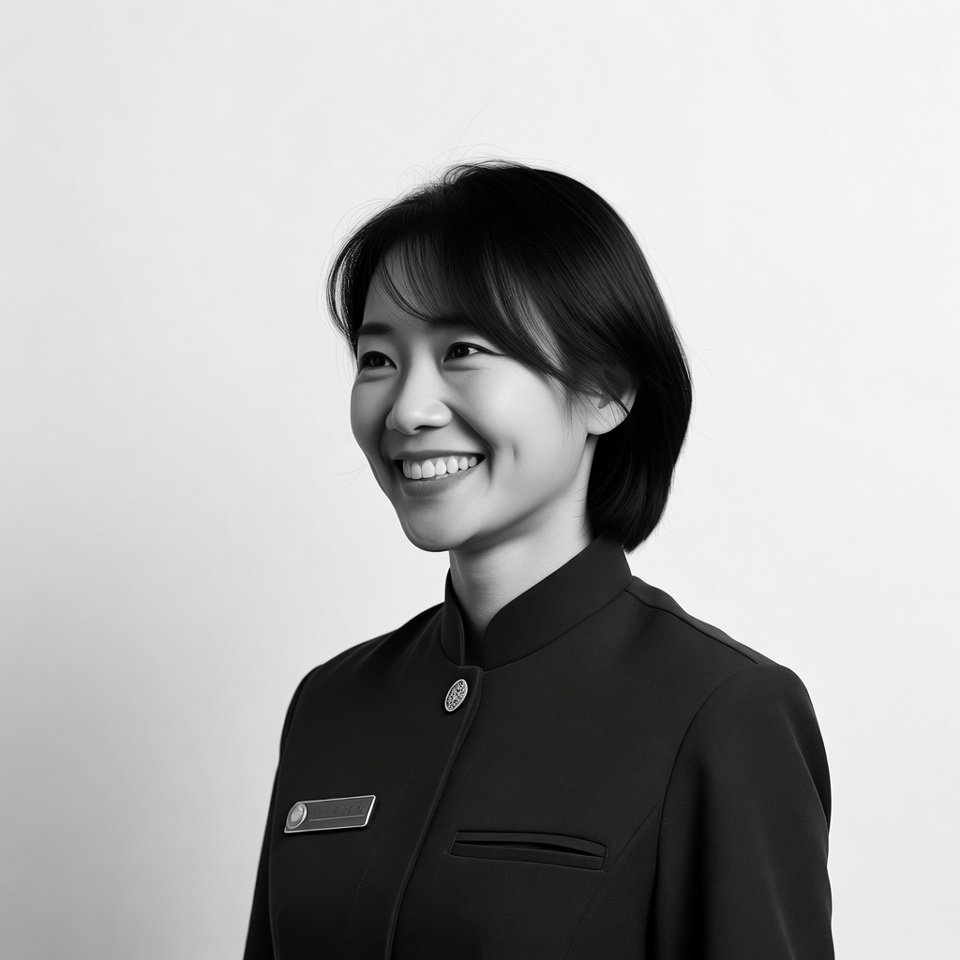 Asian woman in black uniform smiling