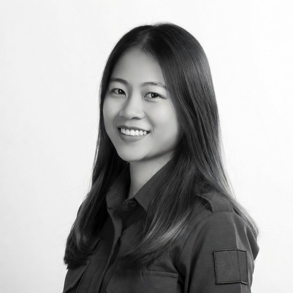 A young Asian woman with long straight hair smiles warmly at the camera. She wears a collared uniform shirt with patches on a plain white background. The black and white portrait shows her head and shoulders in three-quarter view.