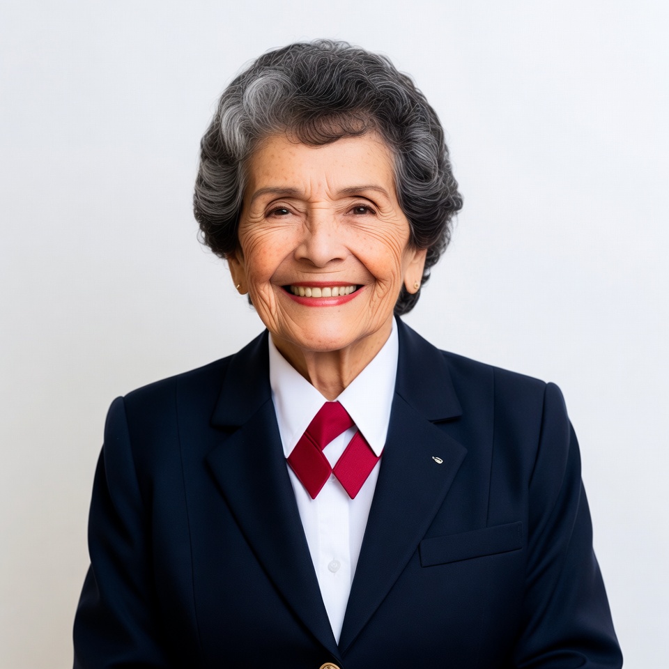 An elderly woman with short gray hair smiles warmly at the camera against a white background. She wears a navy blue blazer, white collared shirt, and red bow tie. Her expression is friendly and professional.