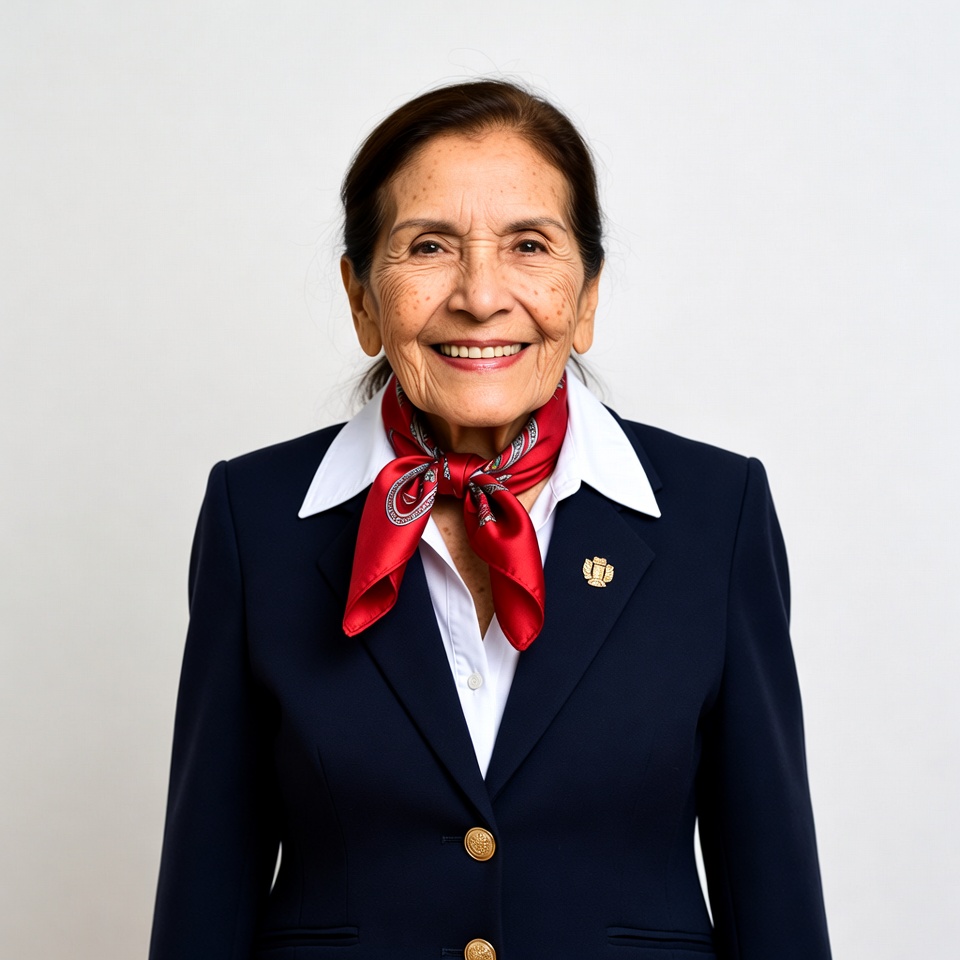 Latino, brown hair, business woman, elderly woman, female, formal wear, gold pin, headshot, navy blazer, portrait, professional attire, red scarf, senior, silk scarf, smiling, white background, white shirt, woman