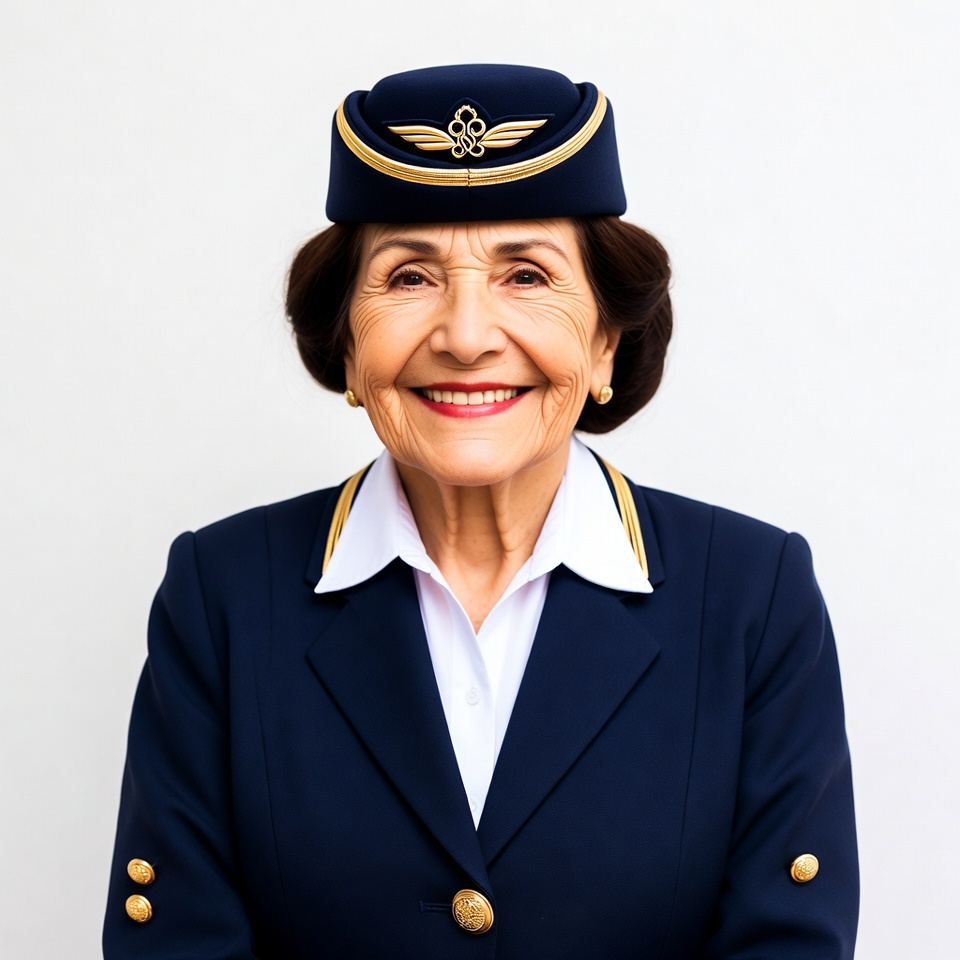 Olympic rings, White, air hostess, aviation uniform, cabin crew, elderly woman, female, gold buttons, gold trim, isolated background, mature woman, navy uniform, pillbox hat, portrait, professional attire, senior woman, smiling, stewardess, white background, white shirt, woman, flight attendant