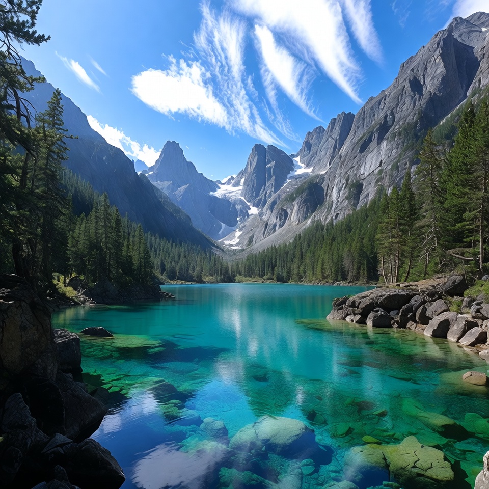 A vibrant turquoise lake reflects towering snow-capped mountains and dense evergreen forests. Fluffy white clouds dot the clear blue sky above rugged peaks. Rocky shores frame the crystal-clear water in this scenic alpine valley.
