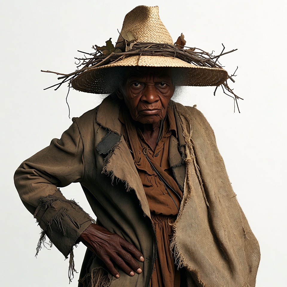 An elderly African-American man with gray hair stands against a white background wearing a wide-brimmed straw hat decorated with twigs and leaves. He has a serious expression and is dressed in ragged brown clothing including a frayed coat and draped fabric. His arms are crossed, emphasizing the textured, worn details of his outfit.