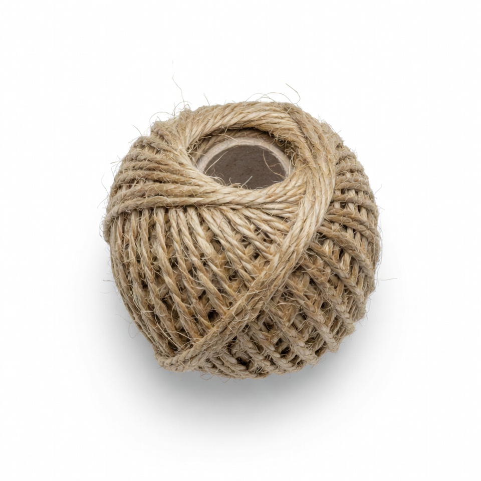 A round ball of natural brown twine sits on a plain white background. The twine is tightly wound with visible fibers and a small dark center hole. It is photographed from a top-down angle, fully isolated.