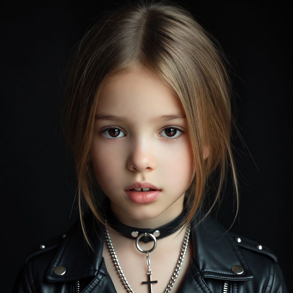 A young girl with light brown hair gazes at the camera against a black background. She wears a black leather jacket with silver studs, a black choker necklace with rings, and a silver cross pendant. Her expression is neutral with slightly parted lips.