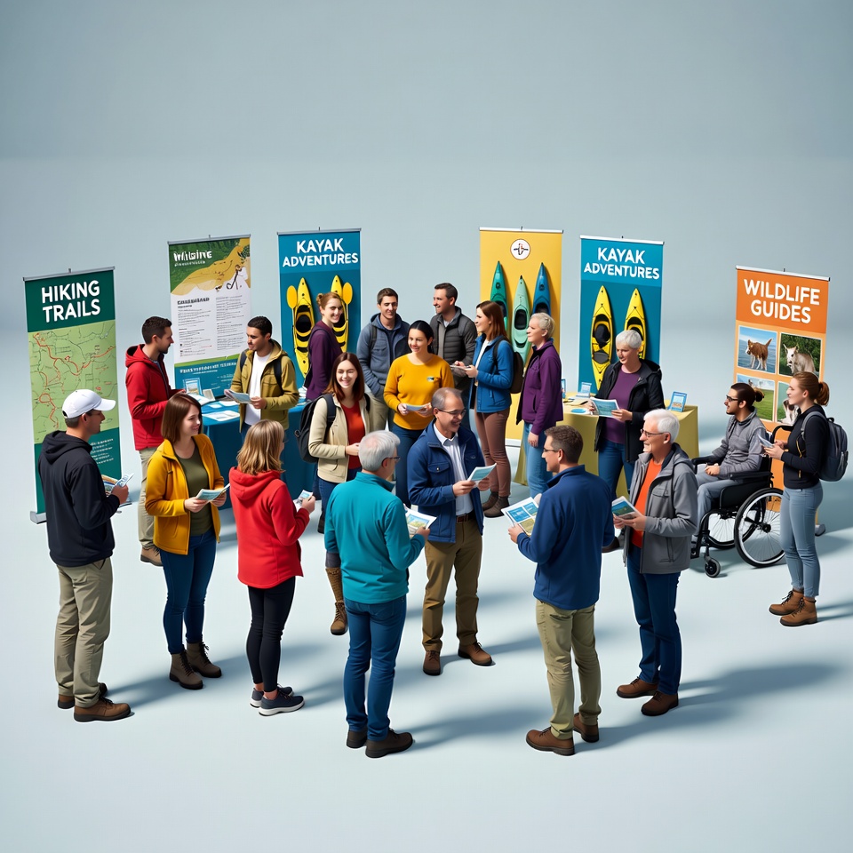 A large diverse group of men and women stands together in front of colorful banners promoting hiking trails, kayaking adventures, and wildlife guides. They wear casual outdoor clothing like jackets, hats, and boots, with some holding brochures. One man in a wheelchair is included among the crowd on a plain background.