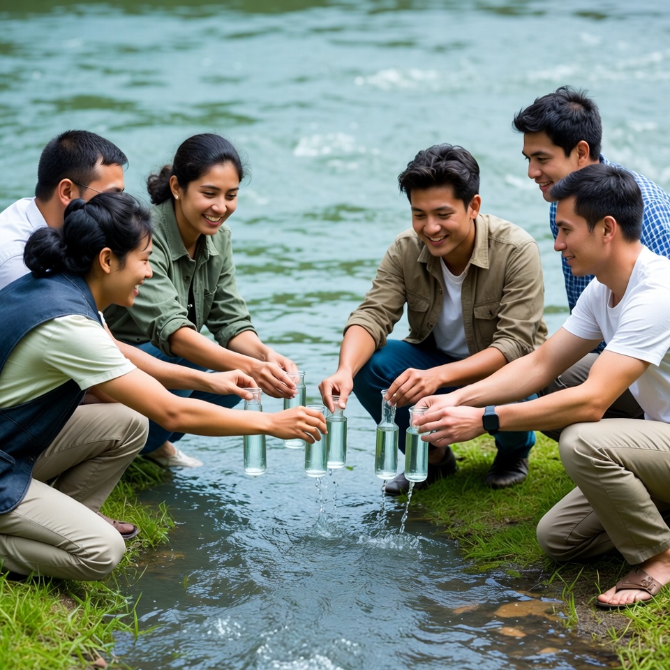 A diverse group of young Asian men and women kneels by a shallow river, holding glass bottles to collect clear water. They wear casual outdoor clothing like jackets and shirts, positioned on grassy banks with flowing water in the background. Several participants smile while participating in the activity.