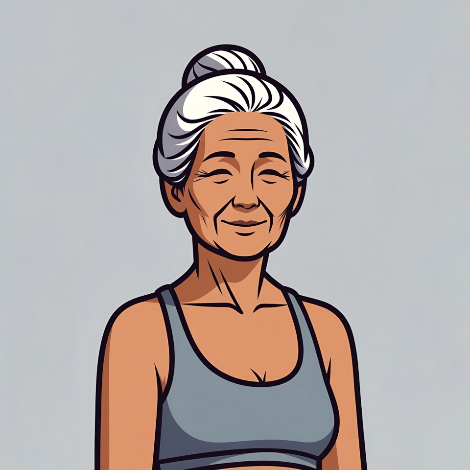 A cartoon illustration of an elderly Asian woman with white hair in a bun smiles gently. She has squinted eyes and wears a gray tank top. The figure stands against a plain light gray background.