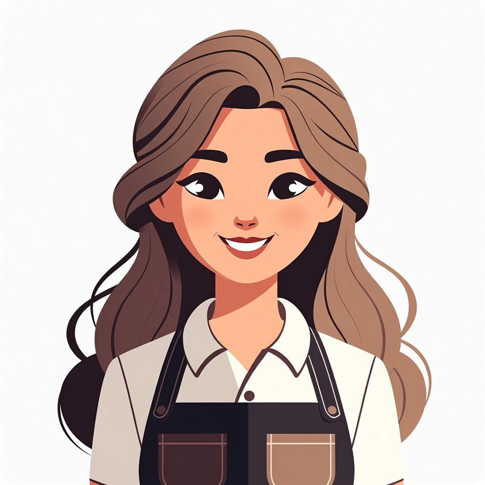 apron, brown hair, cartoon woman, cheerful expression, collared shirt, female, friendly face, graphic design, illustration, isolated background, long hair, modern illustration, portrait, smiling woman, vector art, wavy hair, white shirt, young woman, woman