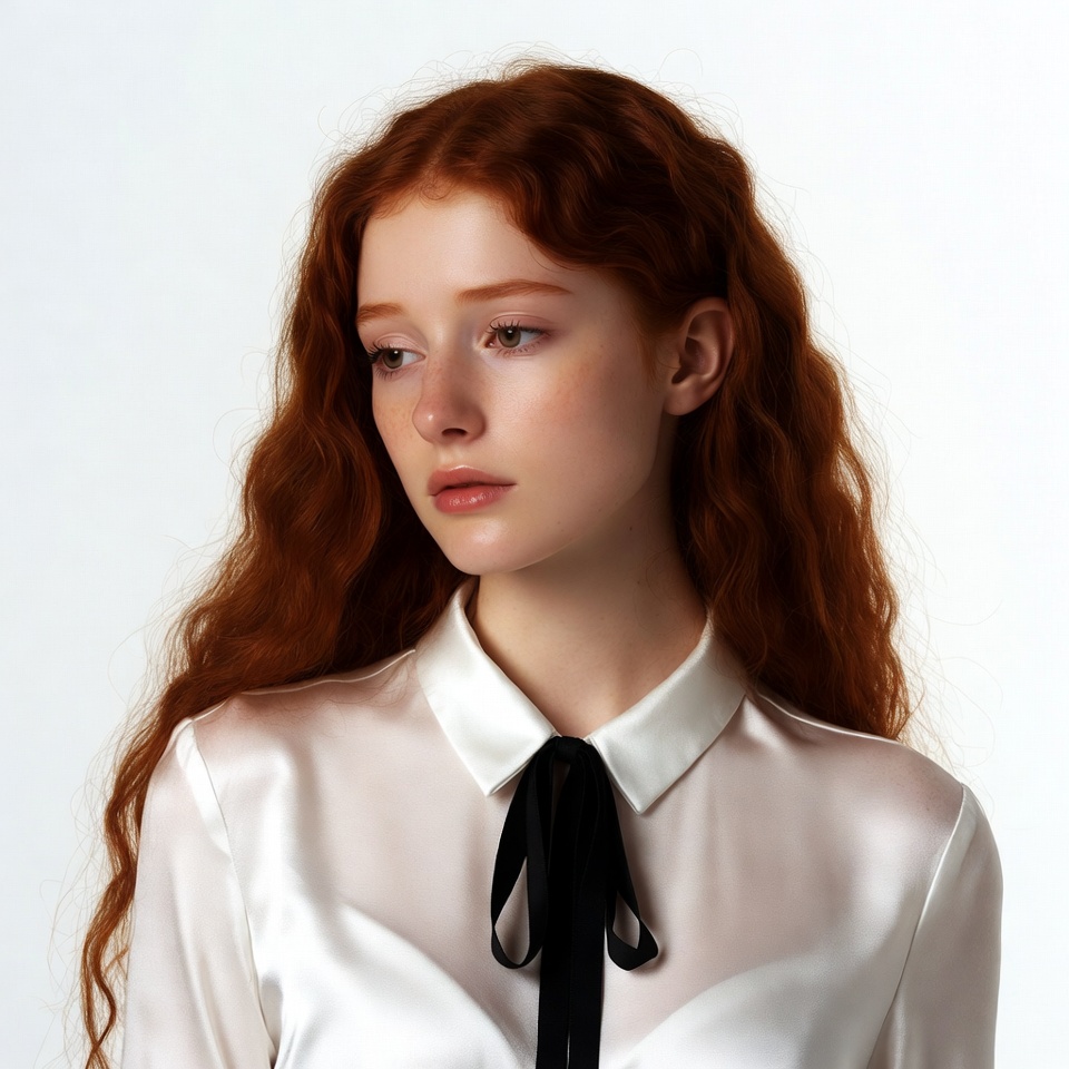 A young woman with long wavy red hair gazes to the side against a white background. She wears a sheer white collared blouse with a black bow tie. Her fair skin and subtle makeup highlight her delicate features.