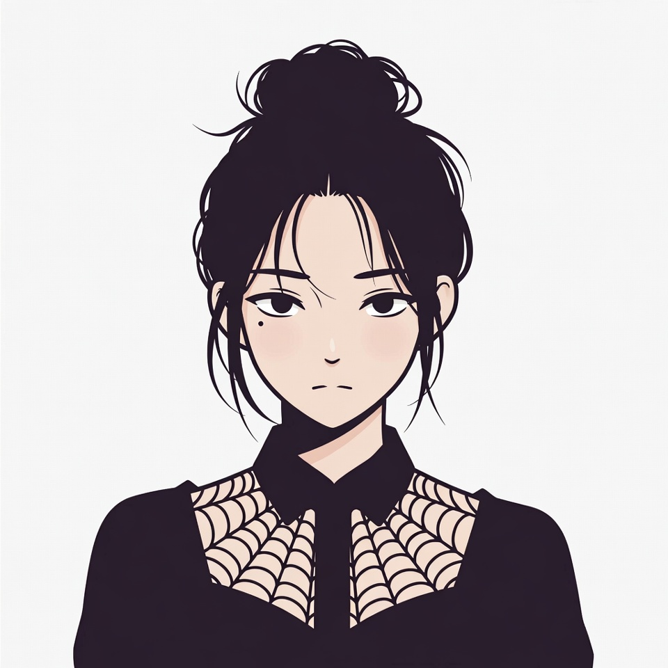 An anime-style illustration of a young Asian woman with black hair in a messy bun. She has sharp eyes and a neutral expression, wearing a black blouse with a detailed spiderweb lace collar. The portrait is set against a plain white background.