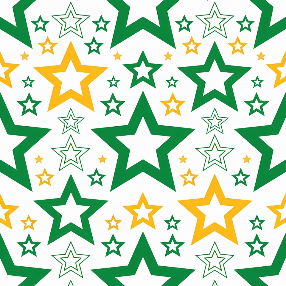 A seamless pattern features overlapping green and yellow stars on a white background. The stars vary in size with bold outlines and solid fills. The design repeats continuously for use as wallpaper or fabric.
