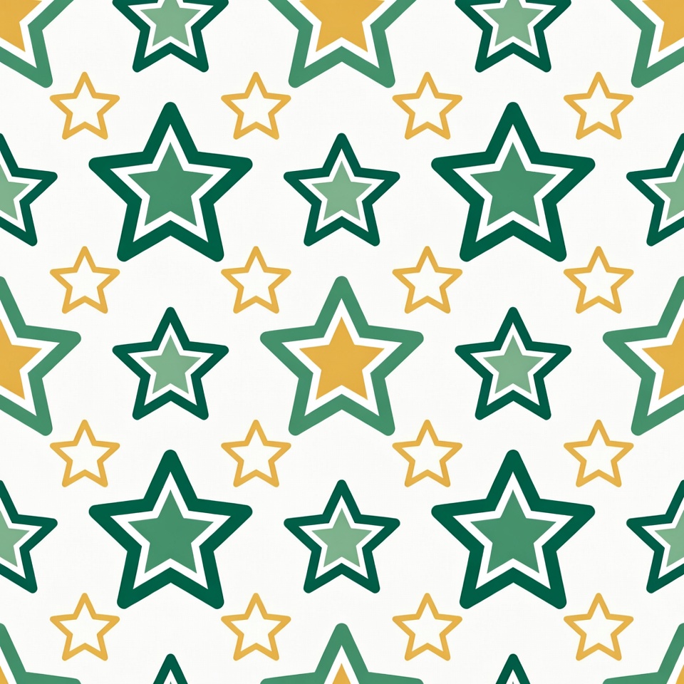 A seamless pattern features numerous five-pointed stars in green and gold colors on a white background. The stars vary in size and have outlined edges for a bold, graphic look. The design repeats continuously for use as wallpaper or fabric.