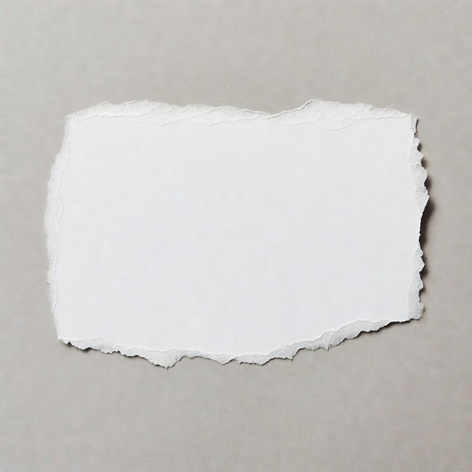 A white sheet of paper with irregular torn edges is placed on a gray background. The paper appears blank and is centered in the frame. The ragged borders give it a ripped, textured look.