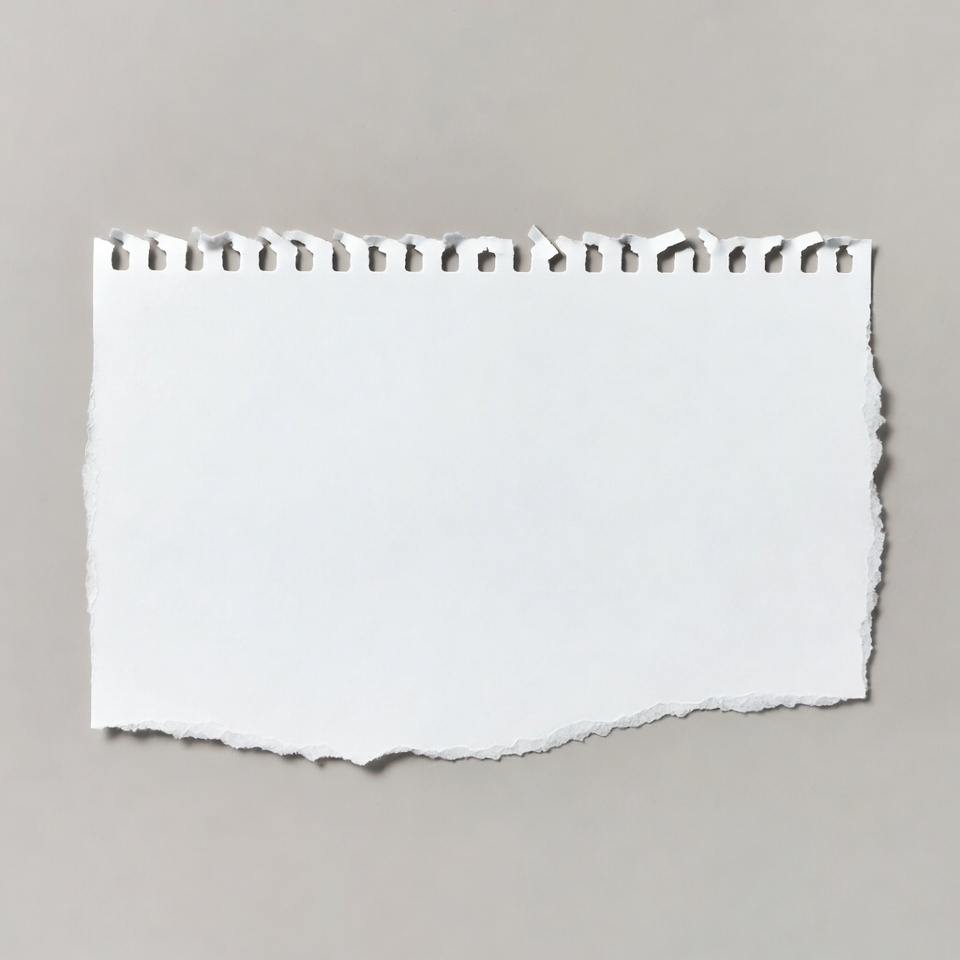 A white blank sheet of paper with torn edges is placed on a gray background. The paper features a spiral binding hole strip along one side and irregular ripped borders. The sheet is empty and centered in the frame.