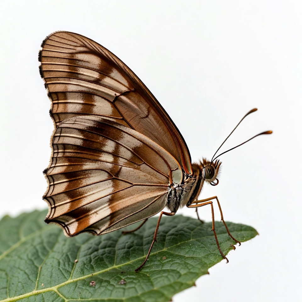 brown butterfly, detailed wings, green leaf, insect, isolated background, leaf perch, macro, nature, perched, white stripes, wildlife, wings, butterfly