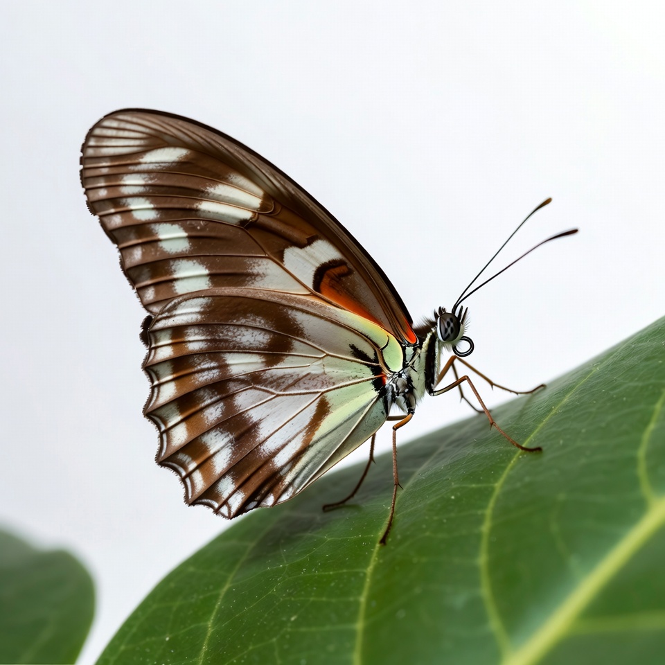 A large butterfly with brown wings featuring white stripes and orange markings rests on a green leaf. Its wings are partially open, displaying intricate patterns and veins. The butterfly is positioned on a fresh leaf against a white background.