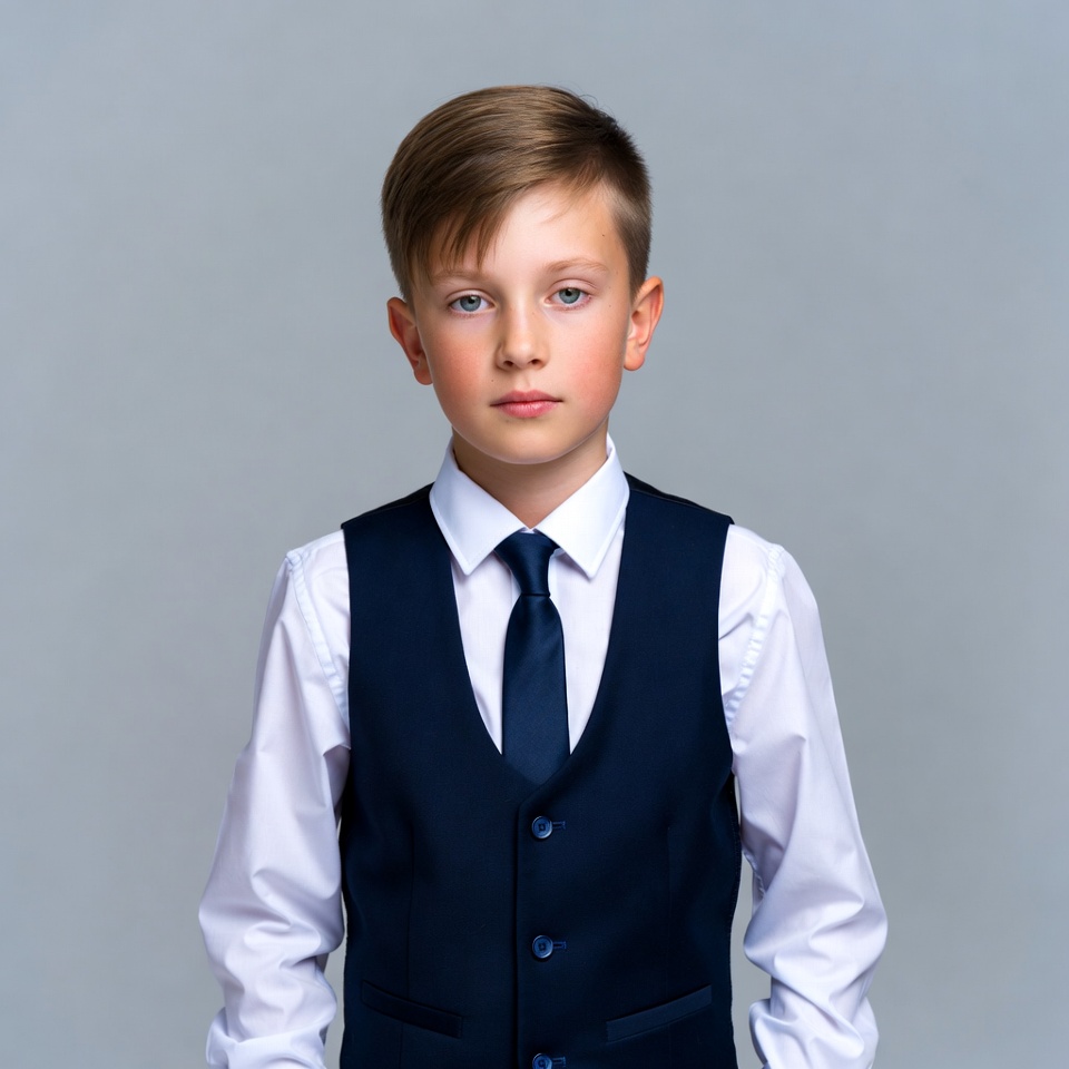 A young boy with short brown hair stands against a plain gray background. He wears a white dress shirt, navy blue vest with buttons, and matching tie. His expression is neutral with hands at his sides.