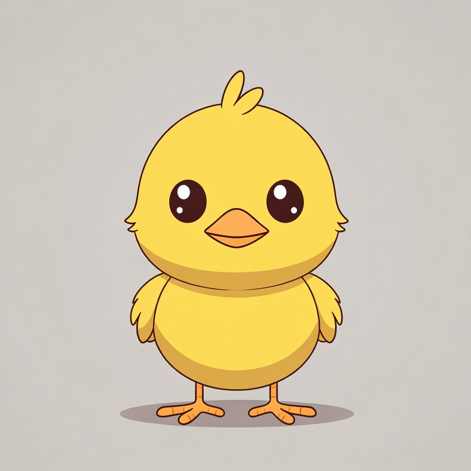 A cute cartoon yellow chick stands on a gray background with big sparkling eyes and a small beak. It has fluffy feathers, tiny wings, and orange feet. The illustration features a simple, isolated design with soft shadows.