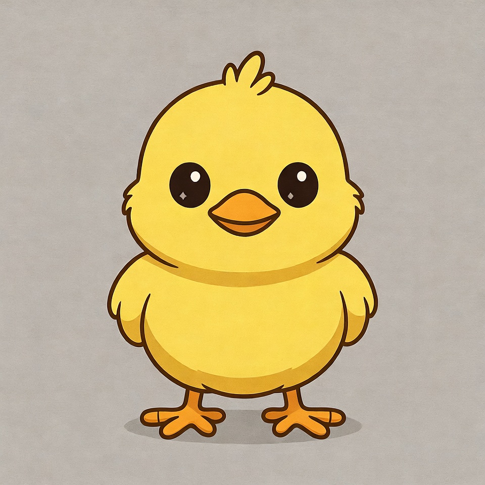 A chibi-style cartoon yellow chick stands on a plain gray background. It has large sparkling eyes, a small orange beak, and fluffy feathers. The illustration features bold outlines and a kawaii design.