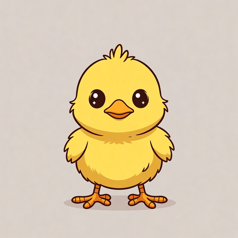 A kawaii-style cartoon yellow chick stands on orange feet with big sparkling eyes and a small beak. Fluffy feathers cover its plump body, and it has a tuft of hair on its head. The chick is centered on a plain light gray background.