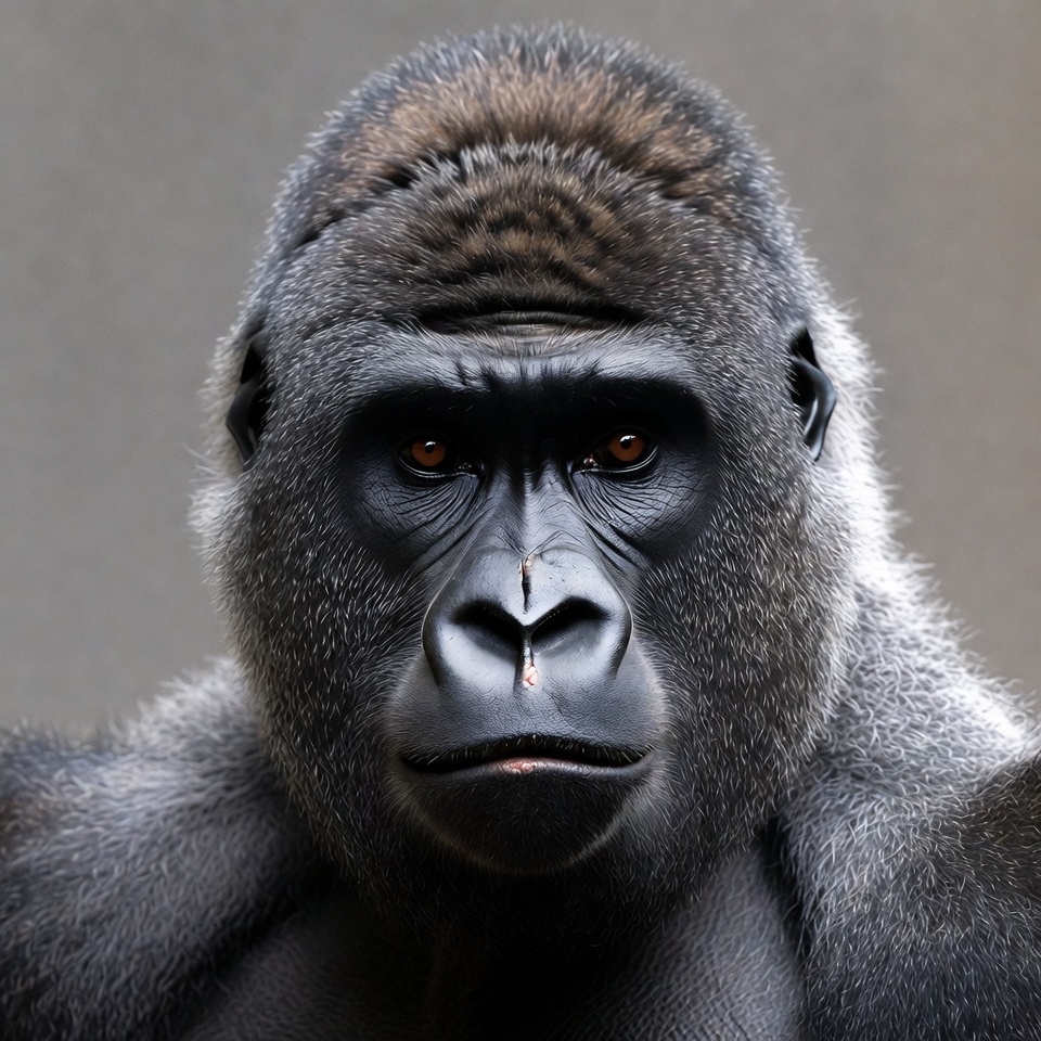 animal, ape, black fur, brow ridge, close-up, face, furry, gray background, head shot, intense gaze, mammals, mouth, nose, portrait, primate, red eyes, silverback gorilla, wild animal, wildlife, zoo animal, gorilla