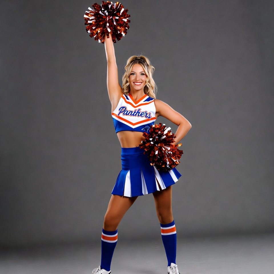 A blonde woman in a blue and orange Panthers cheerleader uniform holds pom poms with both hands raised. She wears a cropped top with white and orange trim, a matching pleated skirt, knee-high socks, and sneakers. She stands confidently on a gray background.