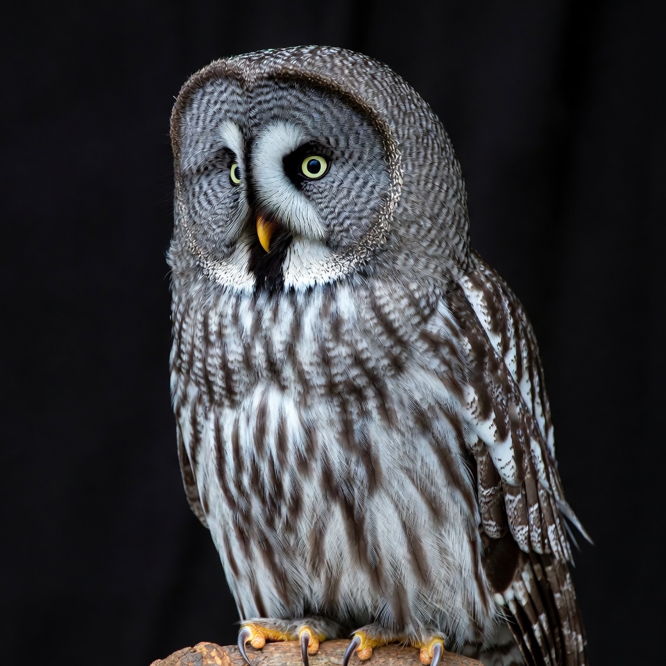 animal, beak, bird, bird of prey, black background, feathers, gray feathers, great gray owl, isolated background, perched, raptor, talons, wildlife, yellow eyes, owl