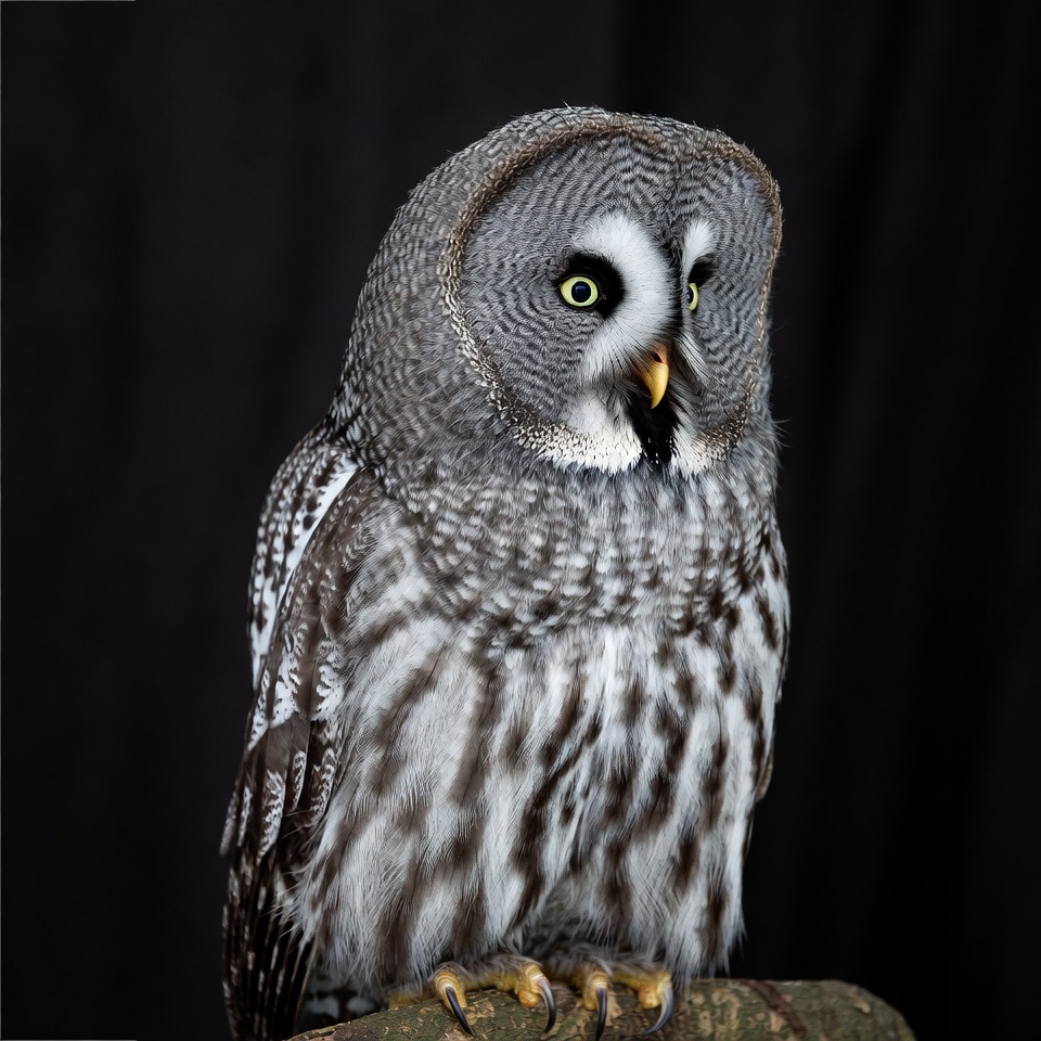 animal, bird, black background, black outline, feathers, gray feathers, great gray owl, isolated background, raptor, talons, white facial disks, wildlife, wooden perch, yellow beak, yellow eyes, owl