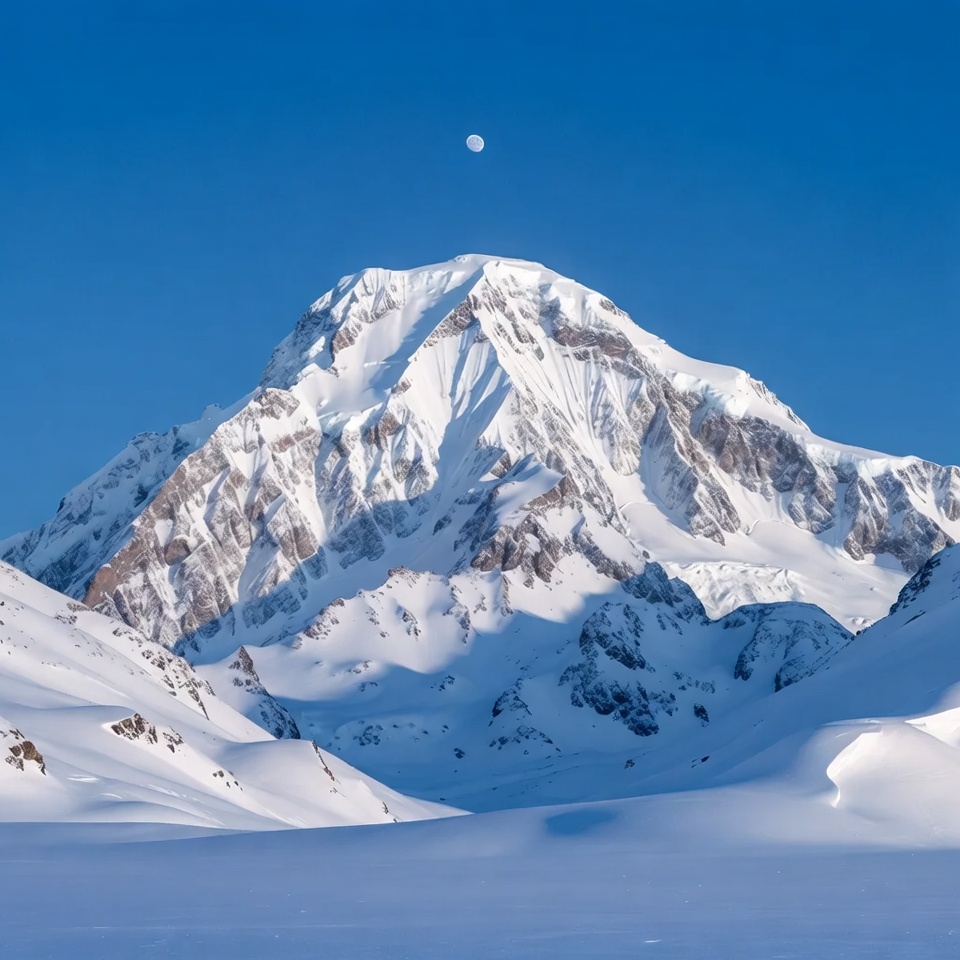 A tall snow-covered mountain rises prominently against a clear blue sky with a bright full moon above. The rugged peak features white snowfields and rocky outcrops. Surrounding slopes and foreground are blanketed in deep snow.