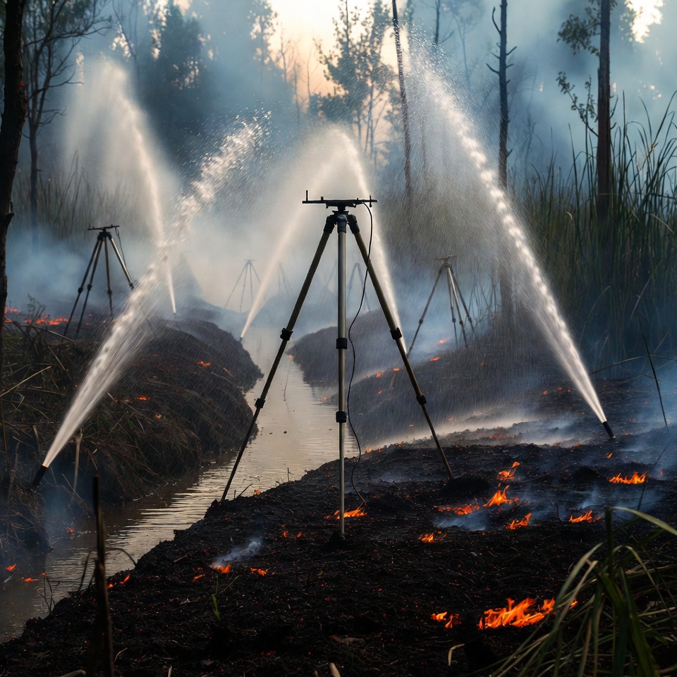 Multiple water sprinklers mounted on tripods spray water in powerful arcs over a burning forest ground. Flames and smoke rise from charred earth and reeds amid tall trees at sunset. A narrow water channel runs through the scorched terrain.