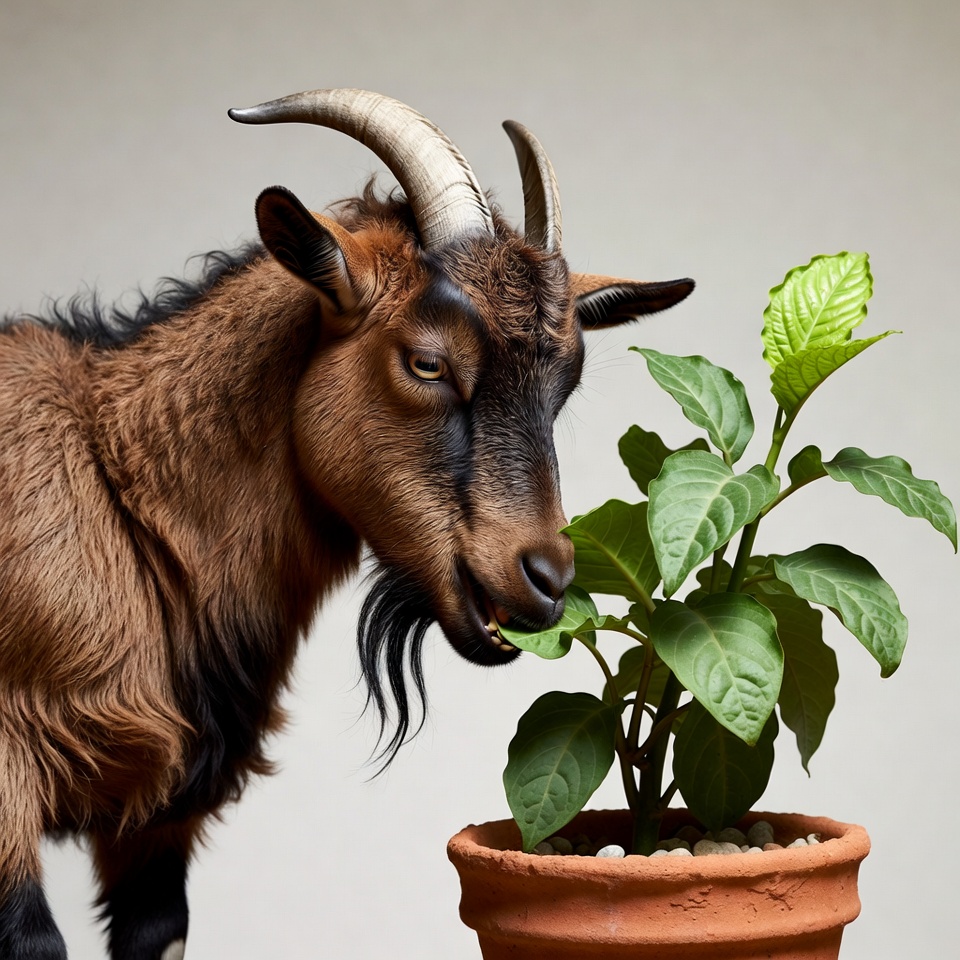 animal, brown goat, chewing leaf, curved horns, cute goat, eating plant, farm animal, goat eating, green leaves, horns, isolated background, leafy plant, potted plant, terracotta pot, goat
