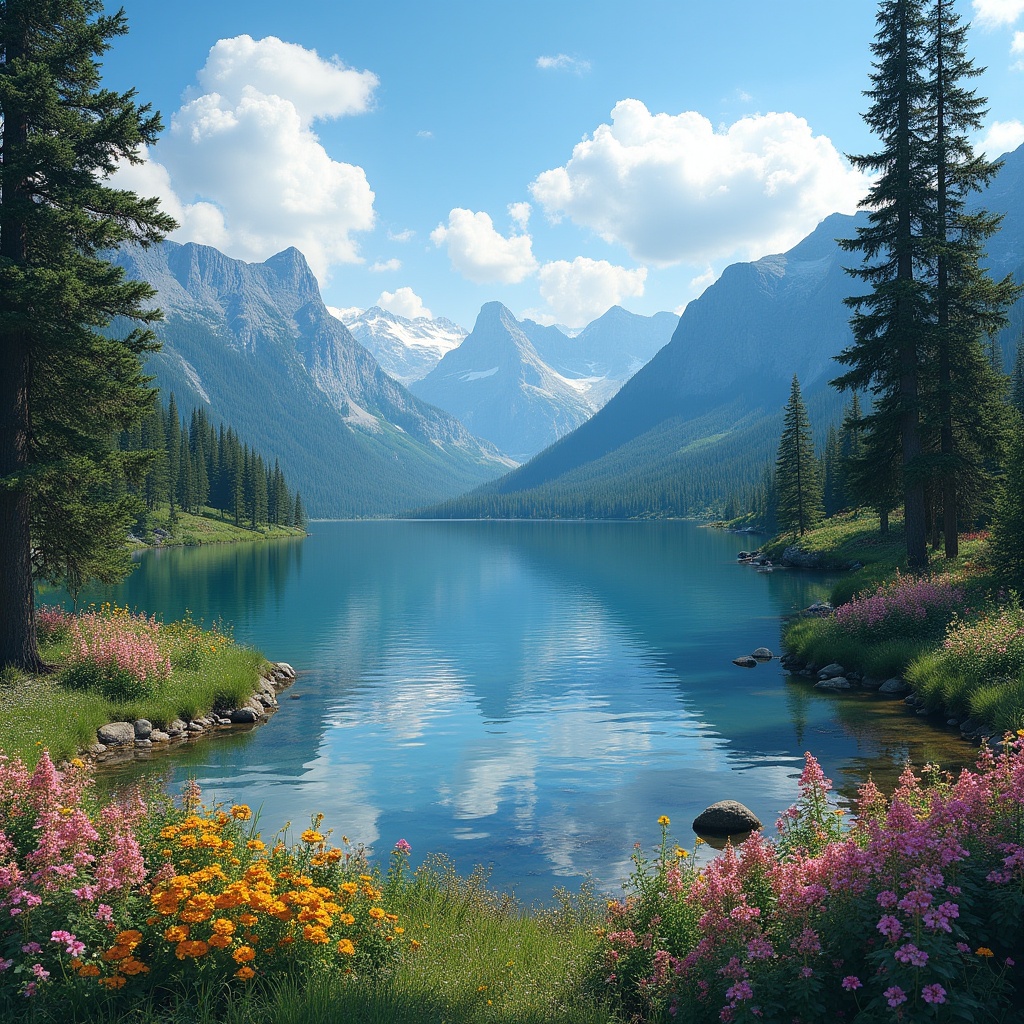 alpine lake, blue sky, clear water, evergreen trees, fir forest, floral foreground, forest lake, grassy shore, green grass, majestic mountains, mountain valley, nature scenery, orange flowers, outdoor nature, peaceful lake, pink flowers, reflection, rocky edges, scenic view, snow-capped peaks, turquoise water, valley landscape, white clouds, wilderness landscape, wildflowers, mountain lake