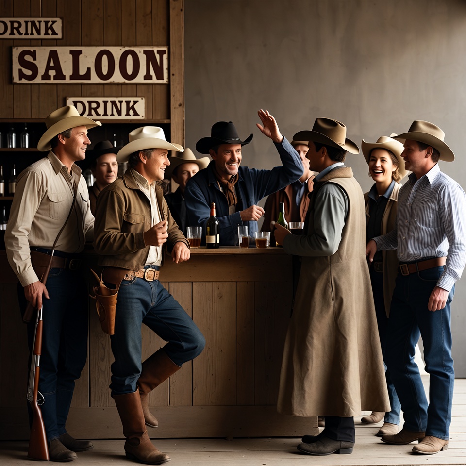 A group of men wearing cowboy hats and western attire stands around a wooden bar in a saloon with a 'DRINK SALOON' sign overhead. They hold beers and glasses, laughing and gesturing, with one woman in a vest nearby. Shelves of bottles line the wall behind the bar.