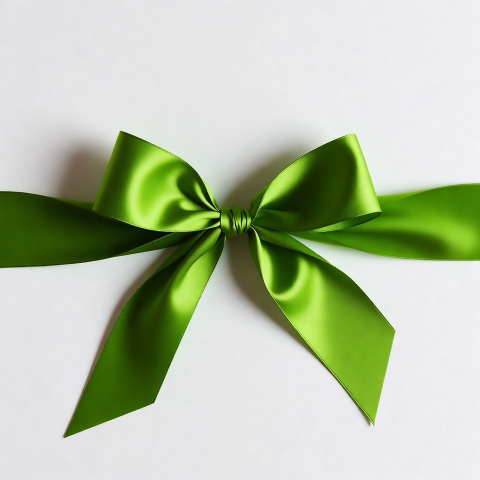A large green satin ribbon bow is tied neatly on a plain white background. The bow features shiny, smooth fabric with long trailing ends extending outward. It is centered and isolated for a clean, simple presentation.