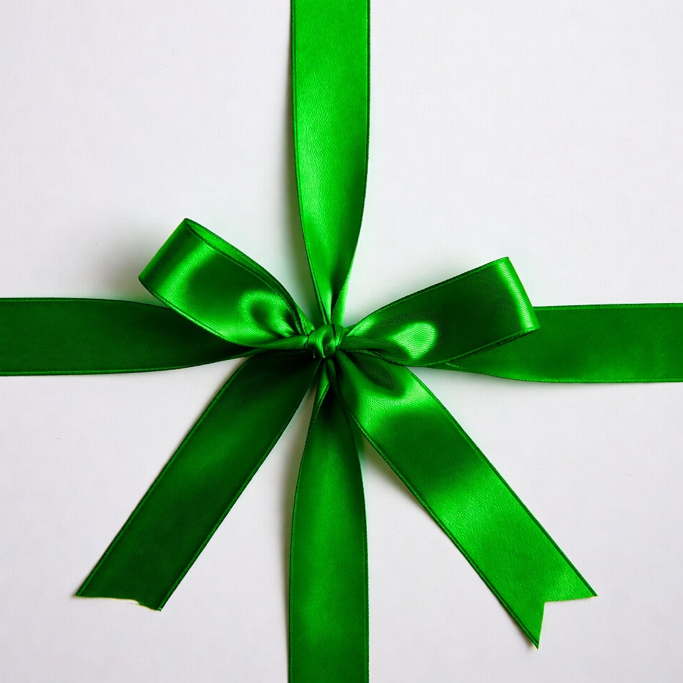 A shiny green satin ribbon forms a large bow and cross on a plain white background. The bow features multiple loops and trailing ends, centered perfectly. The vibrant green color contrasts sharply against the white surface.