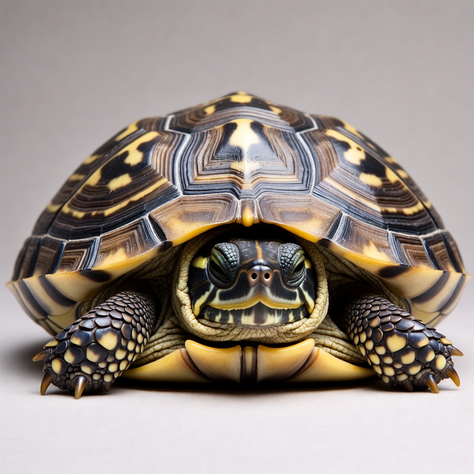A turtle with intricate yellow and black patterned shell faces forward on a plain gray background. Its head protrudes from the shell, showing detailed green skin, yellow markings on the face, and small dark eyes. The legs with scaly texture extend slightly from under the shell.