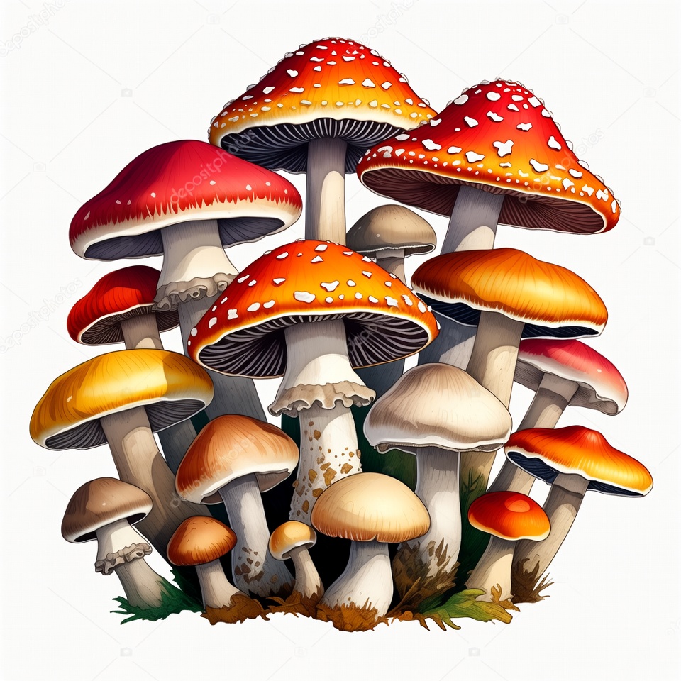amanita muscaria, brown mushrooms, cluster, colorful fungi, cream mushrooms, detailed drawing, digital art, fairy tale mushrooms, fly agaric, forest mushrooms, fungi cluster, green grass, illustration, isolated background, mushroom bouquet, mushroom pile, nature illustration, red mushrooms, spotted caps, toadstool, vibrant colors, whimsical mushrooms, white spots, white stems, mushrooms