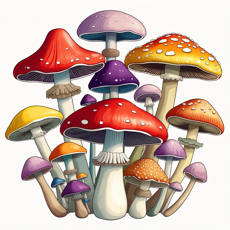 clipart, colorful mushrooms, detailed caps, digital art, fungi, illustration, isolated background, mushroom bouquet, mushroom cluster, orange mushrooms, purple mushrooms, red mushrooms, spotted mushrooms, textured stems, toadstool, vibrant colors, whimsical, white mushrooms, yellow mushrooms, mushrooms
