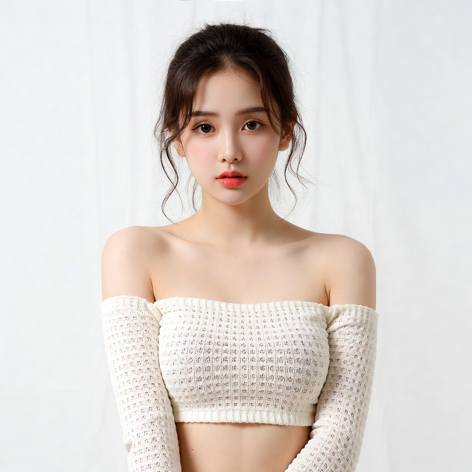 A young Asian woman with long dark hair styled in a neat updo poses against a plain white background. She wears a white off-shoulder knit top with long sleeves and a cropped design exposing her midriff. Her expression is neutral with subtle makeup and pink lips.