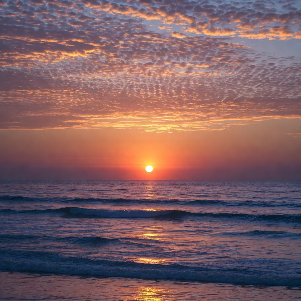 A vibrant sunset illuminates the sky with orange, pink, and purple hues above a calm ocean. The sun hovers low over the horizon, casting reflections on the gentle waves. Wispy clouds streak across the colorful sky.