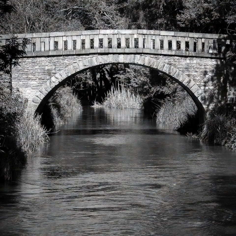arch bridge, black and white, bridge over river, calm water, foliage, forest, landscape, monochrome, nature, outdoor, pathway, reeds, reflection, river, rustic bridge, scenery, stream, trees, water, wooden railing, stone bridge