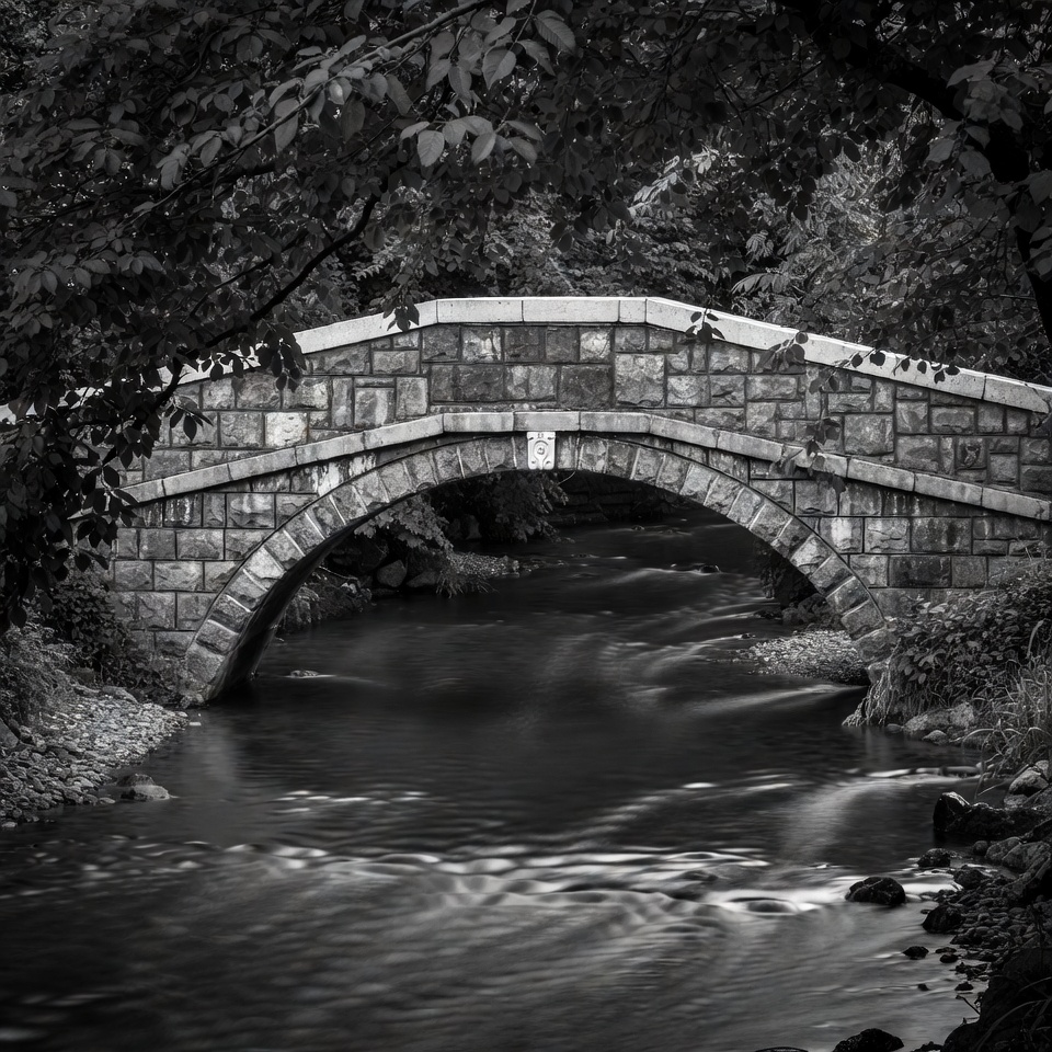 arch bridge, black and white, blurred water, bridge, flowing water, foliage, footbridge, landscape, monochrome, natural setting, nature, outdoor, park bridge, river, rustic bridge, stone arch, stream, surrounded by trees, trees, water, stone bridge