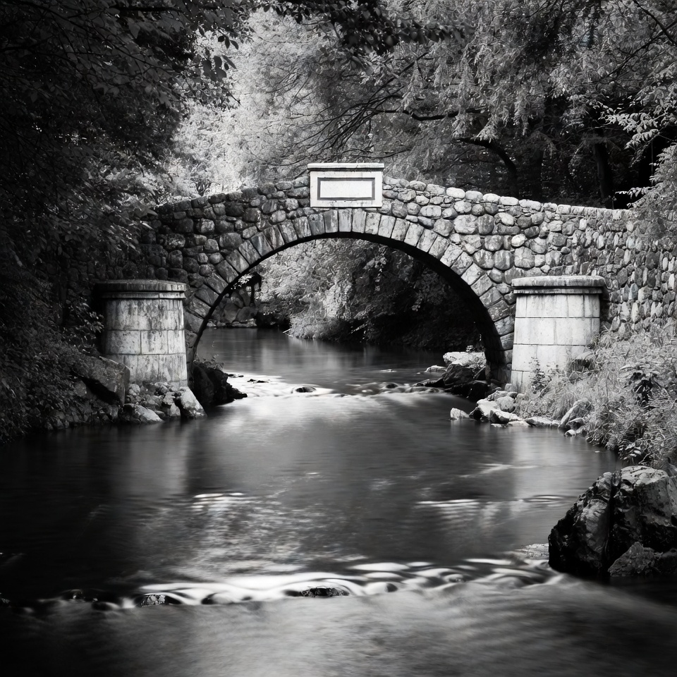 arch bridge, black and white, blurred water, bridge over water, dense forest, flowing water, forest bridge, forest trees, monochrome photo, nature landscape, outdoor nature, river stream, rocky stream, scenic bridge, stone abutments, stone arch, wooded path, stone bridge