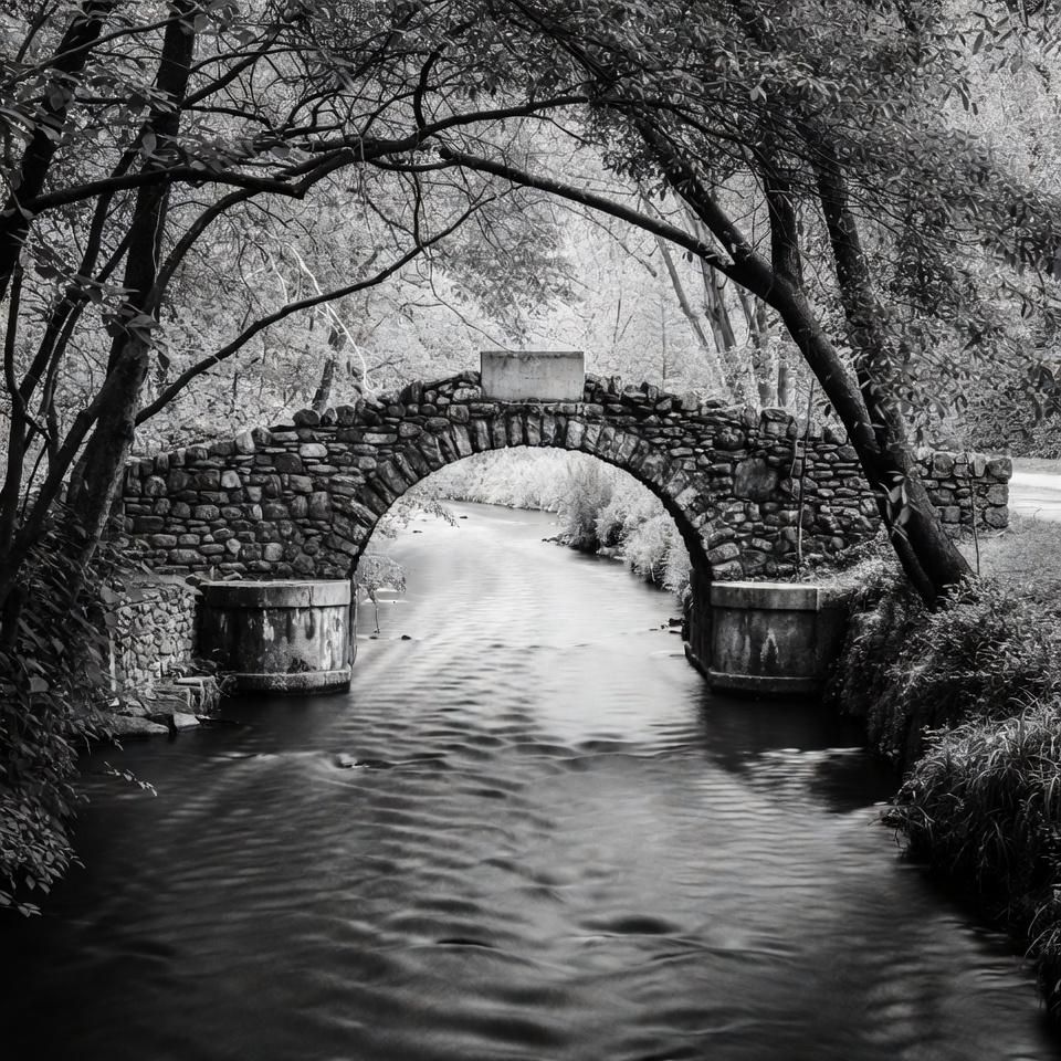arch bridge, arched stone, black and white, foliage, forest, landscape, monochrome, nature, old bridge, outdoor, pathway, river bridge, river crossing, rustic bridge, scenic bridge, stream, trees, water flow, wooded bridge, stone bridge